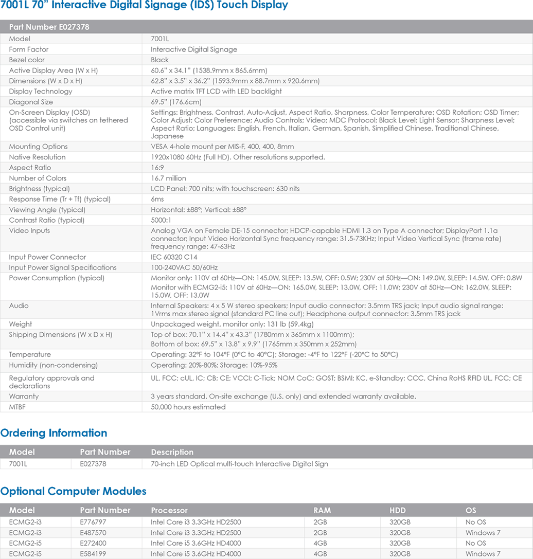 Elo Touch - Monitor Lcd Touch De 70"Digital Signage Display Wall-Mount